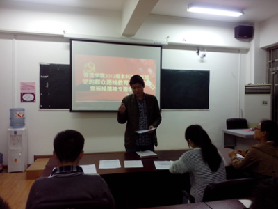 2014年4月25日晚七点,管理学院2012级本科生党支部党的群众路线教育实践活焦裕禄精神专题学习会在管理学院二楼214教室召开。会议由支部书记王珂老师主持,支部正式党员和预备党员共计30人参加了会议(2人请假)。