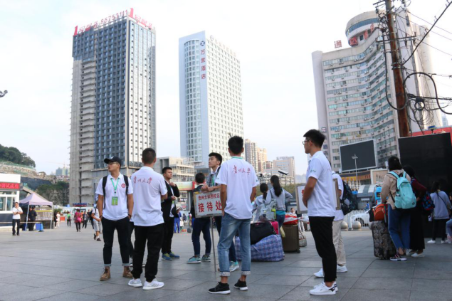 带路的小伙伴是最需要谨慎的,因为贵阳火车站附近路况复杂,人流量大,一不小心就容易走散,所以通常都是由至少三个以上的志愿者同学,一前一中一后的引领,才把新生队伍带到乘车地点。途中需要穿过一条斑马线、一段窄而长的护栏、一个公交车聚集的公交站牌群、一个空旷的体育馆广场。