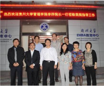 10月25日下午,管理学院院长李烨教授率EMBA迎评办副主任周莉莉老师、EMBA教育中心常务副主任刘梅老师一行访问了郑州大学商学院MBA、EMBA教育中心。参观了郑州大学商学院MBA、EMBA中心的教室、案例讨论室、联合会办公室、模拟试验室、茶歇室等办学硬件设施后,双方在学院一楼会议室进行了交流座谈,郑州大学商学院高有才院长及MBA、EMBA项目相关工作人员参加了会谈。