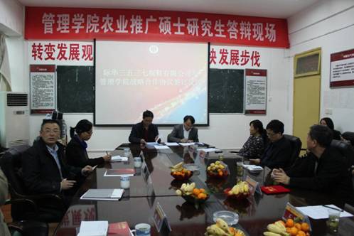 2013年12月6日,际华三五三七制鞋有限公司与我院战略合作协议签订仪式暨客座教授受聘仪式在我院309室成功举行,际华三五三七制鞋有限公司的董事长杜江、副总经理杨俊、人力资源部部长毛常月、党务部部长张伟,我院党委书记陶玉顺、院长李烨、副院长林岚涛、副院长王婷、党委副书记于松出席仪式, 我院EMBA教育中心、MBA教育中心、研究生科负责人参加了仪式。