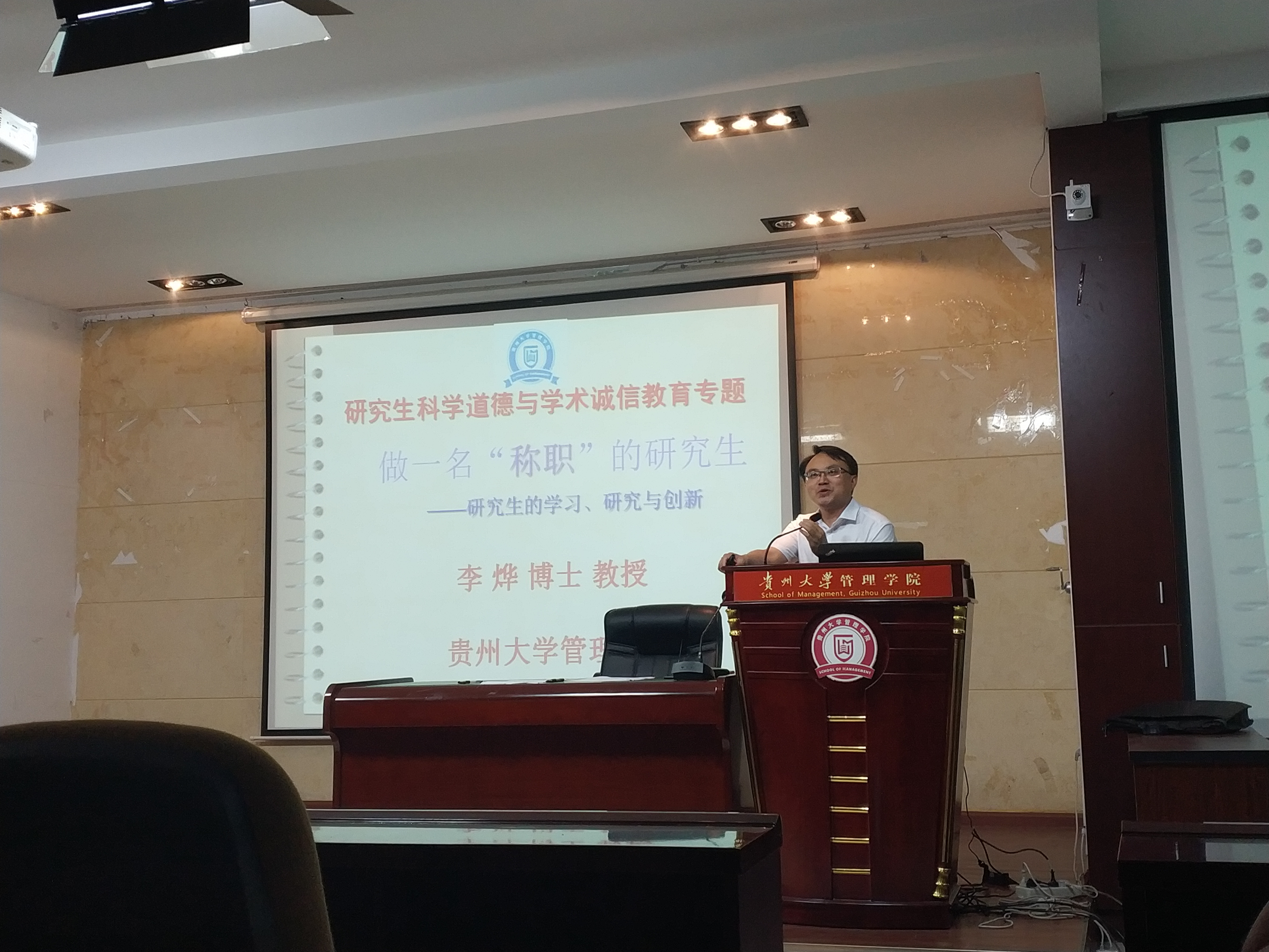 20187419:00,在管理学院三楼报告厅,管理学院2017级全日制研究生(学术型、专业型)开展学习科学道德与学风建设第三次课程。此课程由管理学院院长李烨教授主讲。李教授以“做一名“称职”的研究生——研究生的学习、研究与创新”开展本次课程。