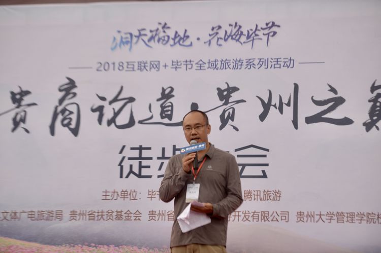 毕节市旅发委副主任施正军致辞欢迎和感谢各界来宾,首先介绍了毕节毕节阿西里西韭莱坪,接着介绍整个毕节市的旅游发展现状和毕节的旅游业态,重点突出跨界合作的强大助推之力,毕节旅游发展驶入互联网+全域旅游的“快车道”,花海网红节等一项项精彩互联网活动、“向黔一公里”互联网+旅游产业助力扶贫活动盛大启动、以及此次的“贵商论道·贵州之巅”徒步大会,大力协助毕节旅游产业和扶贫工作的进一步发展,让花海毕节旅游再度开出一朵“精神之花”。并衷心希望在座各界朋友能继续关注和支持毕节的旅游的发展,支招毕节旅游、投资毕节旅游,共创、共享贵州山地旅游产业蓬勃发展的大市场。