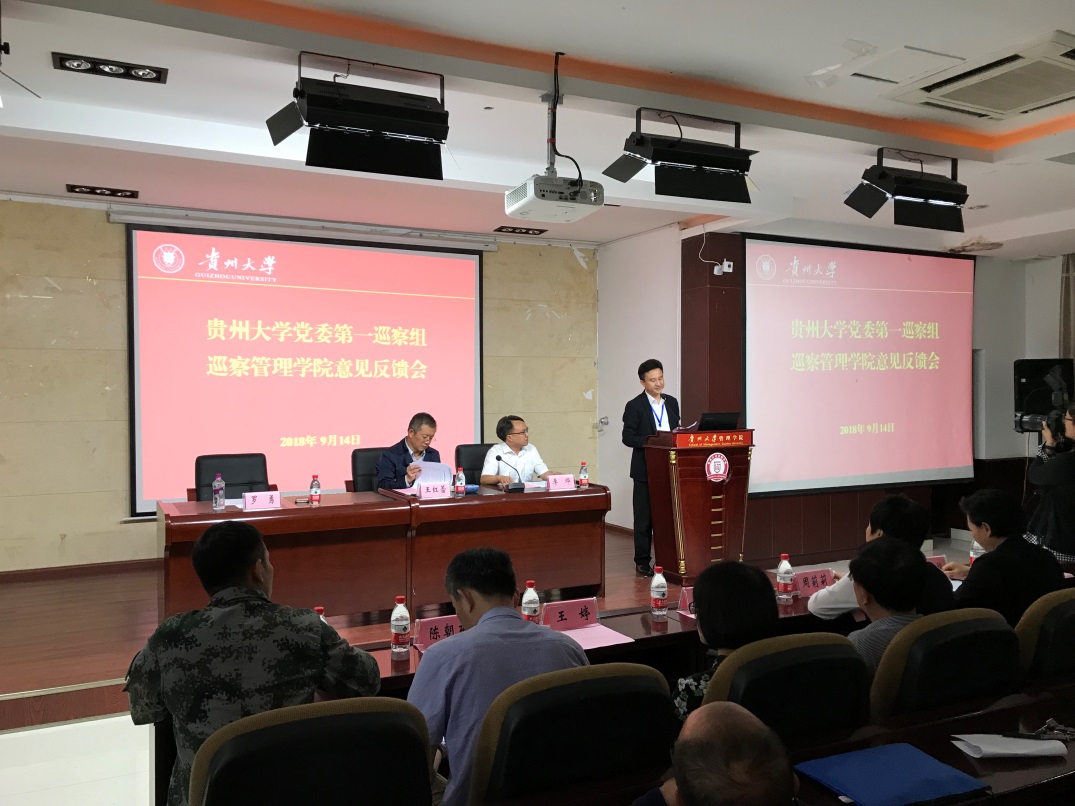 校党委第一巡察组组长罗勇组长首先肯定了管理学院近几年来取得的成绩,并以“文科振兴”的高度评价了管理学院拿到的两个一级学科博士点,实现了贵州大学文科博士点的突破。