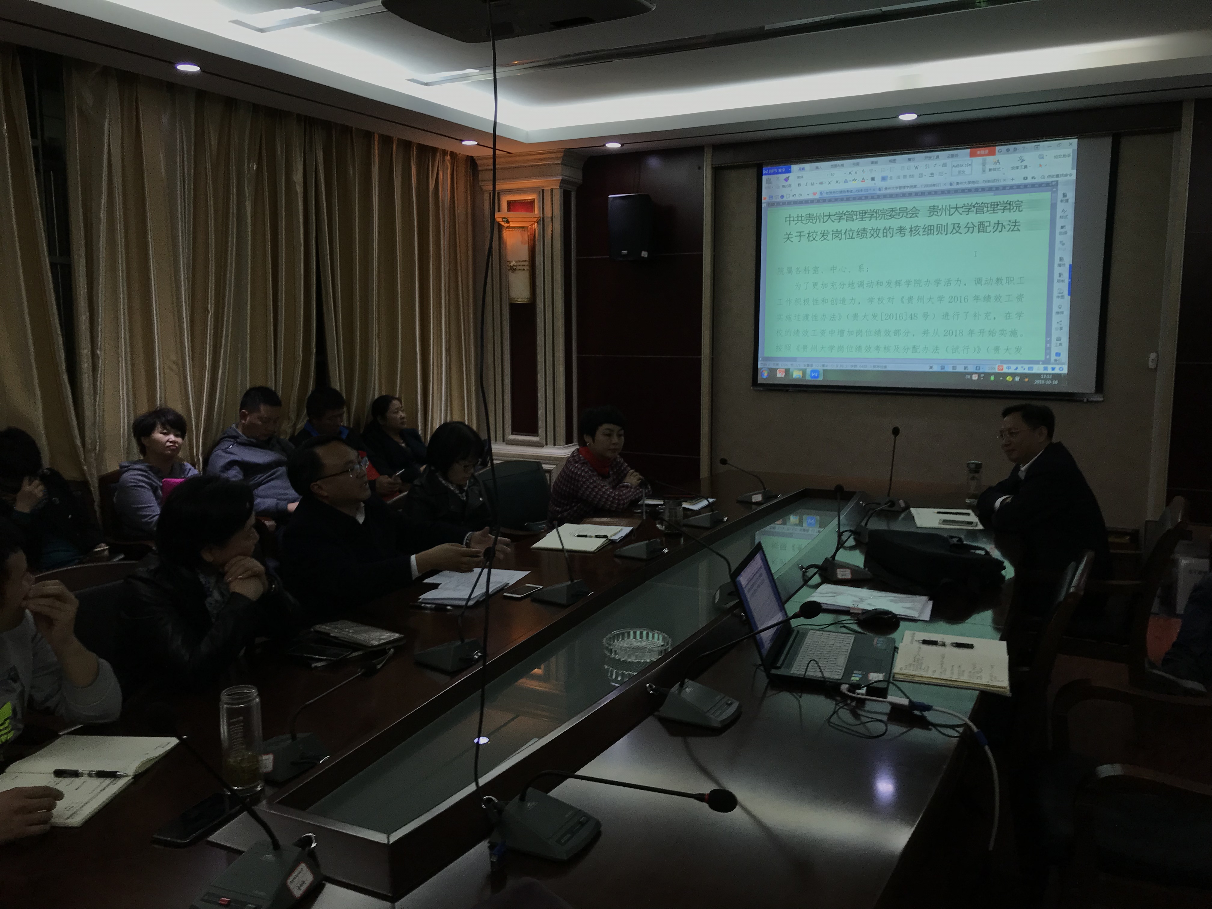 其次,李院长传达了《贵州大学岗位绩效考核及分配办法(试行)》(贵大发〔2018〕175号)的文件精神,指出学院须对绩效考核及分配办法进行修订和完善,补充制定岗位绩效部分的考核及分配办法,进行岗位绩效的考核及分配。学院本着效率优先、兼顾公平的原则,拟定了考核细则及分配办法(初稿)。