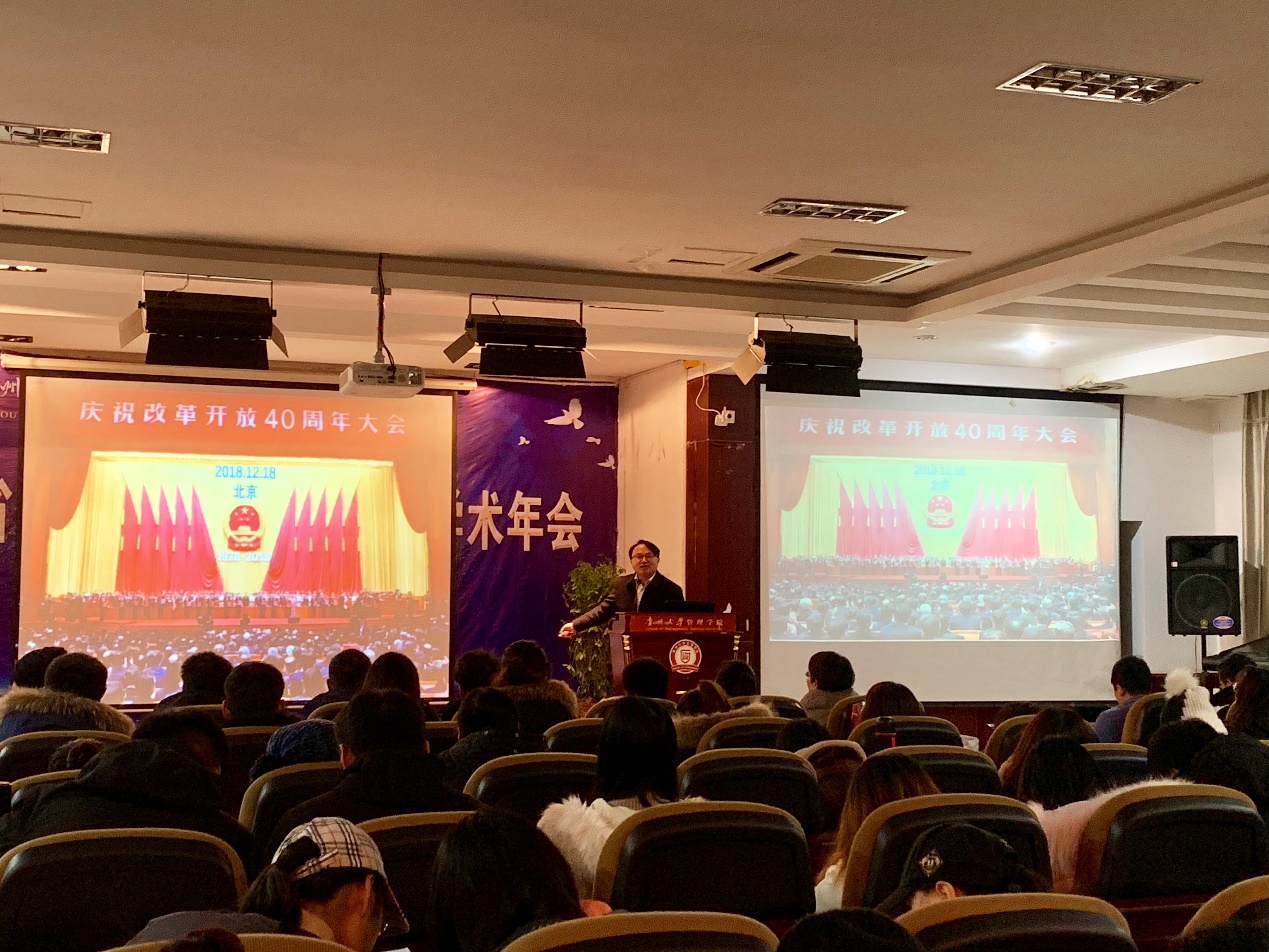 2019年1月3日晚18:30分,管理学院在学院三楼报告厅组织开展“改革开放40周年---回顾与展望”的主题宣讲会,宣讲会由学院院长李烨教授主讲,学院2018级研究生和研究生党员近150余名同学参加,宣讲会由学院专职组织员、研究生科科长徐兰老师主持。