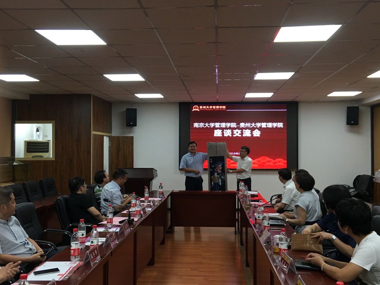 会上,李烨院长对王跃堂院长一行到访管理学院表示欢迎。李烨院长向南京大学管理学院的嘉宾们介绍了贵州大学的发展历程及管理学院的现状、学院发展的总体思路、师资队伍结构、学科专业及服务地方经济建设等相关情况。王婷副院长介绍了我院在科研及国际交流方面的情况;周莉莉副院长介绍了我院研究生学位论文管理及EMBA/MBA的发展情况;宋山梅副院长介绍了我院本科教育在教学质量方面等的情况。王跃堂院长介绍了南京大学管理学院的基本情况,重点介绍了南京大学管理学院学科发展及师资培养的具体办法。随后双方就学术科研、教学、人才培养、等方面进行了交流探讨。最后李烨院长向王跃堂院长重点介绍了贵州大学及管理学院设立科研特岗的具体情况,希望双方在科研、师资培养等方面建立战略合作关系,王跃堂院长表示高度赞同。会后,李烨院长向王跃堂院长赠送了礼品并合影留念。