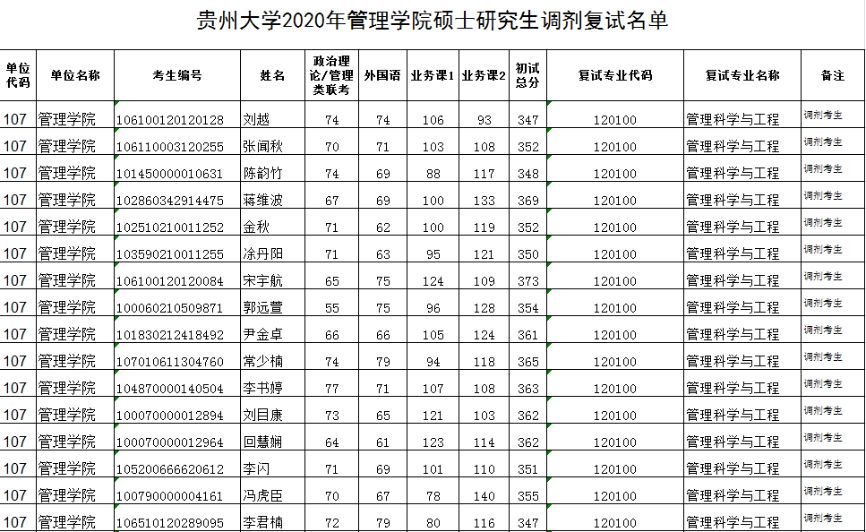 贵州大学2020年管理学院硕士研究生调剂复试名单