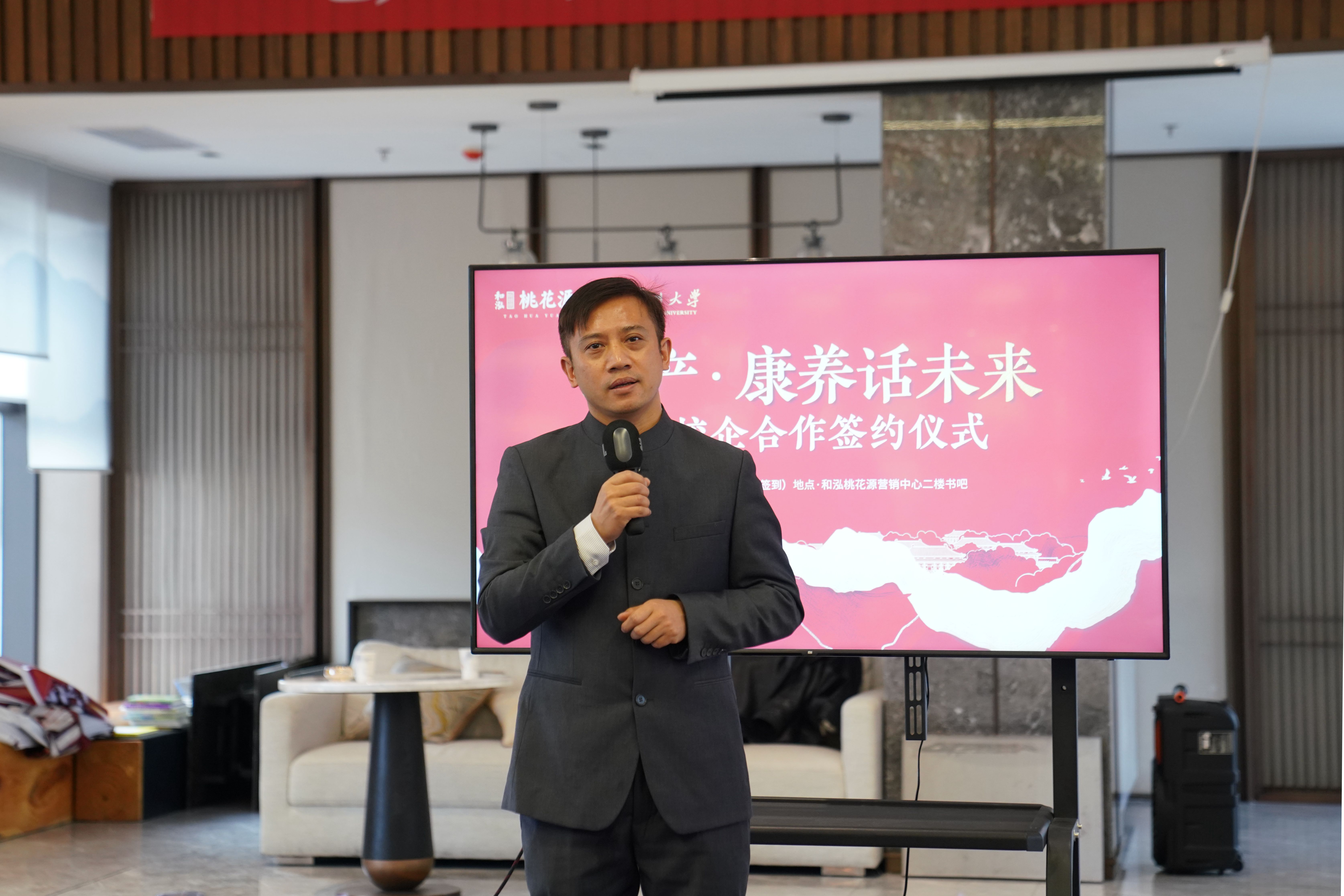 贵州和泓投资有限公司董事长刘起龙首先做讲话。他向与会人员介绍了和泓桃花源项目的具体发展情况,他表示,校企合作目的是为深化校企交流,推动一体化合作办学,促进校企共同发展。