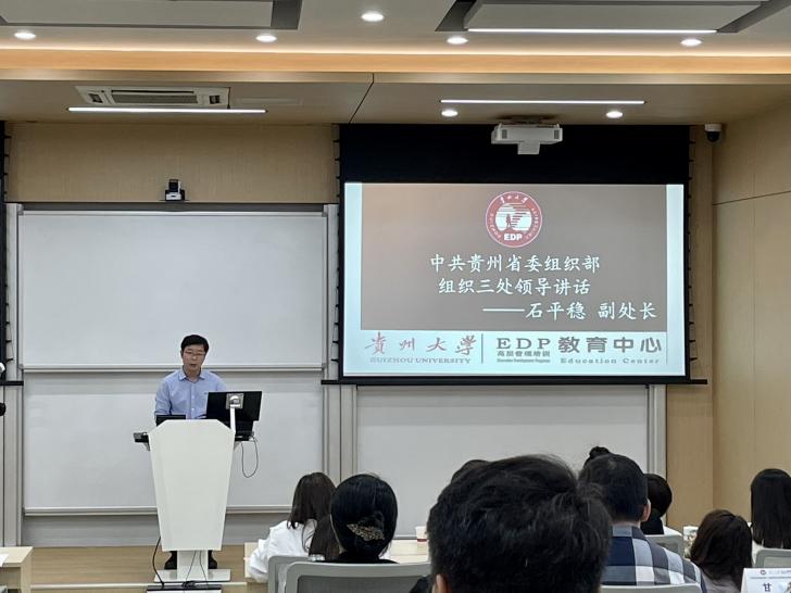 中共贵州省委组织部组织三处副处长石平稳,贵州大学党委副书记令狐彩桃、贵州大学组织部副部长张瑞良,贵州大学对外合作处副处长,贵州大学教育培训管理工作专班负责人付芳,乐动官方网站党委书记王秀峰、乐动官方网站副院长宋山梅,贵州大学EDP教育中心主任张勇出席本次培训开班式。