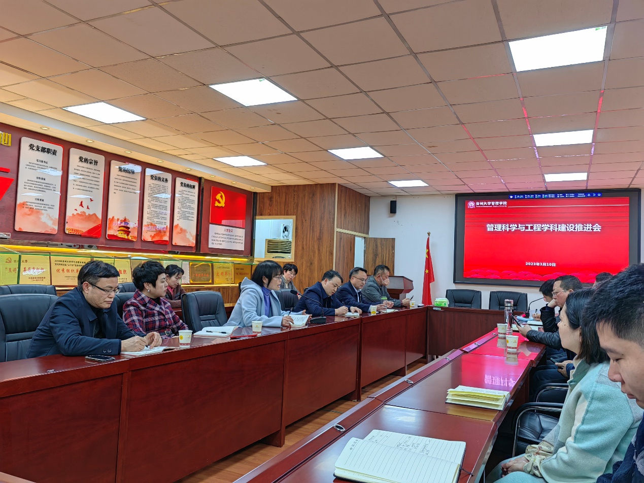 贵州大学原常务副校长,管理科学与工程学科带头人王红蕾教授、校发展规划处处长冉光圭教授、校人文社科处副处长周乐欣教授、数学与统计学院副院长胡支军教授以及管理学院院长李烨教授、校党委正处级组织员、院党委副书记(主持党委工作)周莉莉教授、副院长李本光教授、副院长王婷教授出席了本次会议,管理科学工程系的教师参加了会议。会议由李烨院长主持。