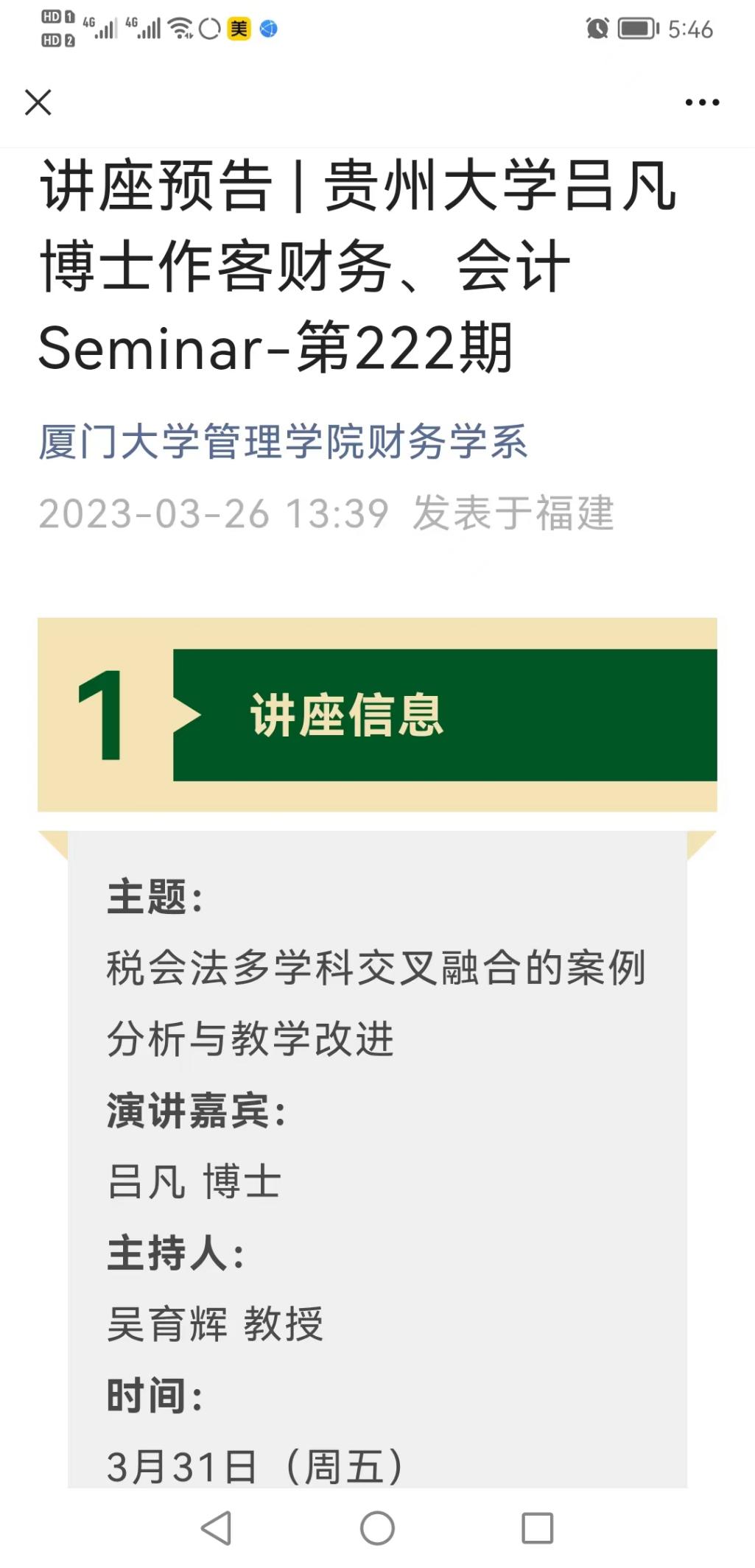 3月31日管理学院会计系主任吕凡老师应邀前往厦门大学管理学院,开展了“税会法多学科交叉融合的案例分析与教学改进”的专题讲座。