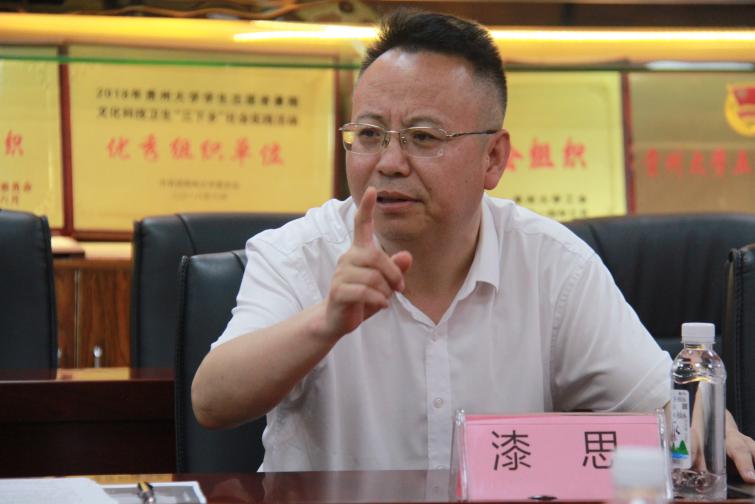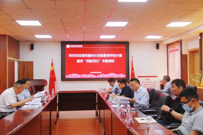 2023年5月29日下午,贵州大学副校长漆思莅临管理学院开展专题调研,在学院三楼陈列室召开了服务“四新”“四化”专题调研座谈会。管理学院院长李烨、副院长李本光,以及各系主任和相关部门负责人参加会议。
