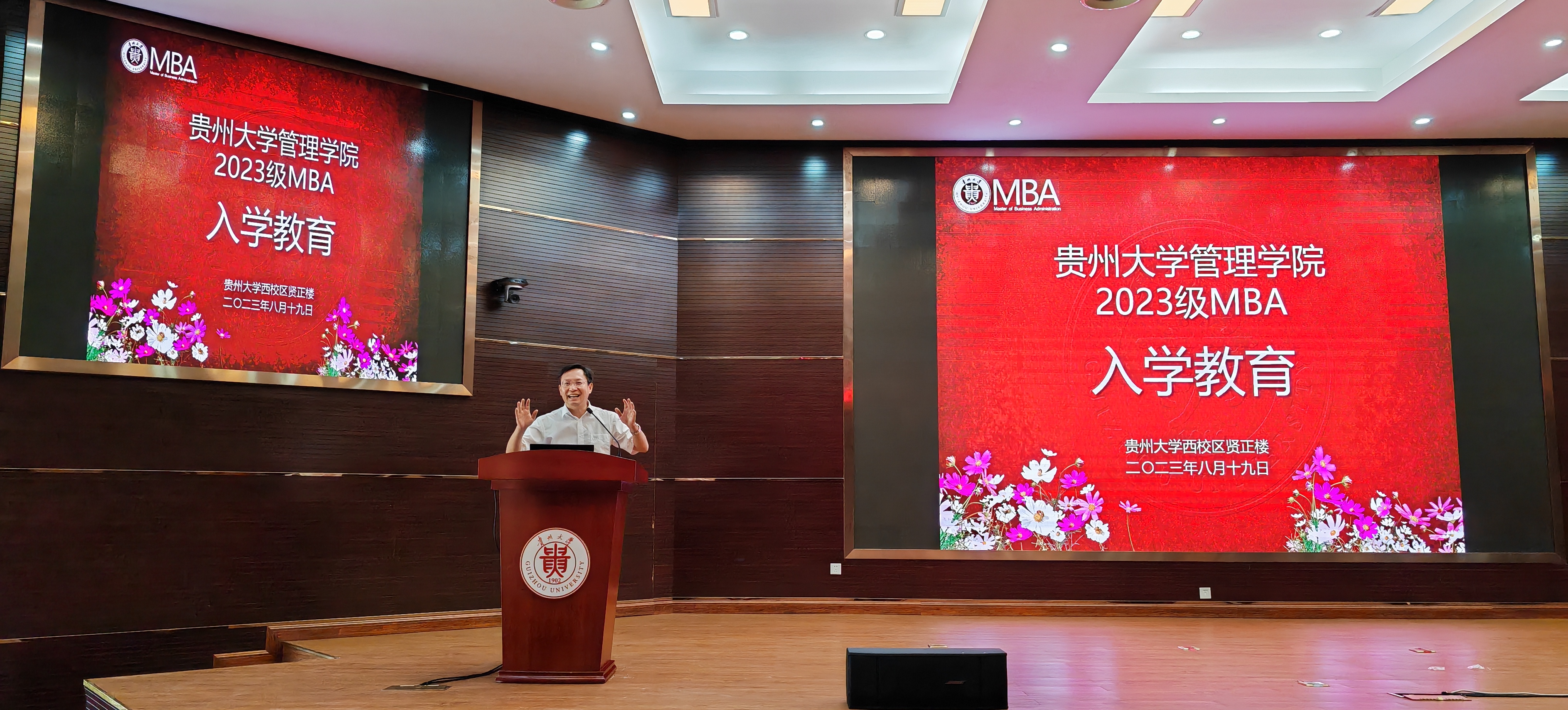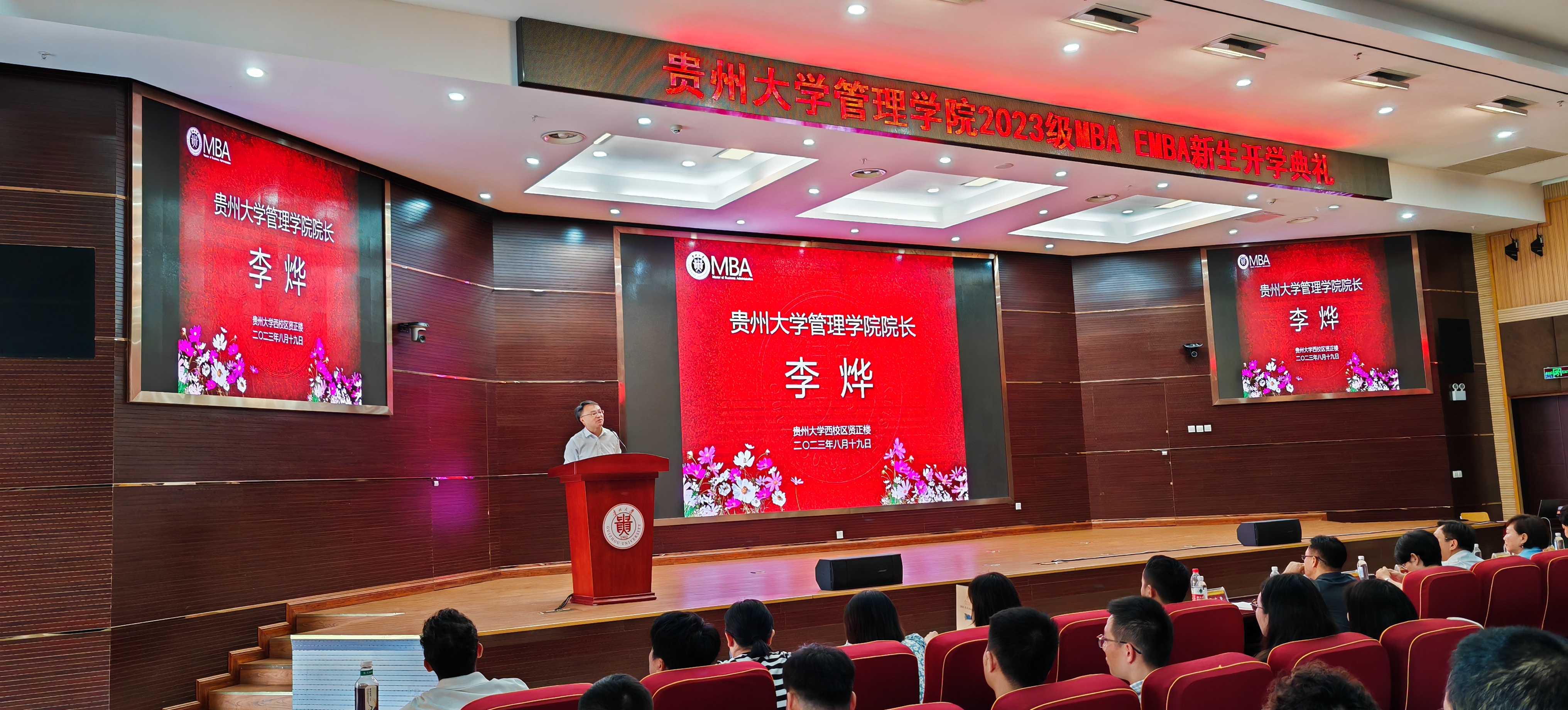 2023年8月19日上午,乐动官方网站MBA教育中心在西校区贤正楼107报告厅隆重举行了“乐动官方网站2023级工商管理硕士(MBA暨EMBA)开学典礼”。乐动官方网站院长李烨教授,贵州大学党委正处级组织员、管理学院党委副书记(主持党委工作)周莉莉教授,管理学院副院长李本光教授,副院长宋山梅教授,副书记邓琳老师,MBA中心主任项凯标教授,MBA导师代表刘遗志教授,管理学院各科室负责人、MBA教育中心全体老师、班主任,2023级MBA、EMBA新生共460余名参加了开学典礼。典礼由副院长李本光教授主持。
