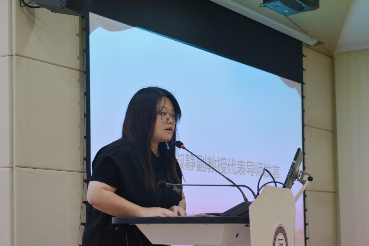 梁淑静老师作为硕士生导师代表上台发言,她送给了同学三句话。一是既要敢为人先,也要锲而不舍。做学术时开拓进取、主动选择新方向、新话题;被拒稿时不要害怕、不要焦虑,根据意见修改文章。二是既要有开放包容的学习态度、也要有严谨求实的科研作风。多看高水平的文章、多参加专业学术会议,拓宽自己的视野,遵守学术道德、践行学术规范。三是既要有舍我其谁的自信,也要有从善如流的虚心。天道酬勤,功不唐捐、没有白看的书,没有白读的文献,坚信自己选择的研究方向和研究问题,但也要学会接受批评和建议。