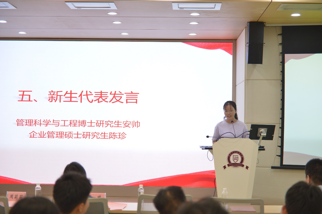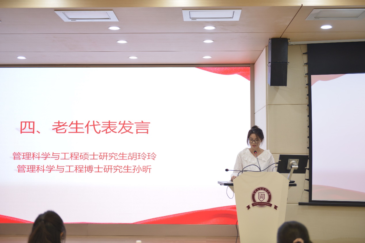 老生代表管理科学与工程硕士研究生胡玲玲、管理科学与工程博士研究生孙昕分别分享了自己的求学经历,为新生提供了宝贵的建议。她们提醒新生:我们应该时刻怀揣对科研的敬畏和激情,在科研中锻炼自己强大的内心,在生活中保持乐观心态,遇到事情全力以赴、不留遗憾。