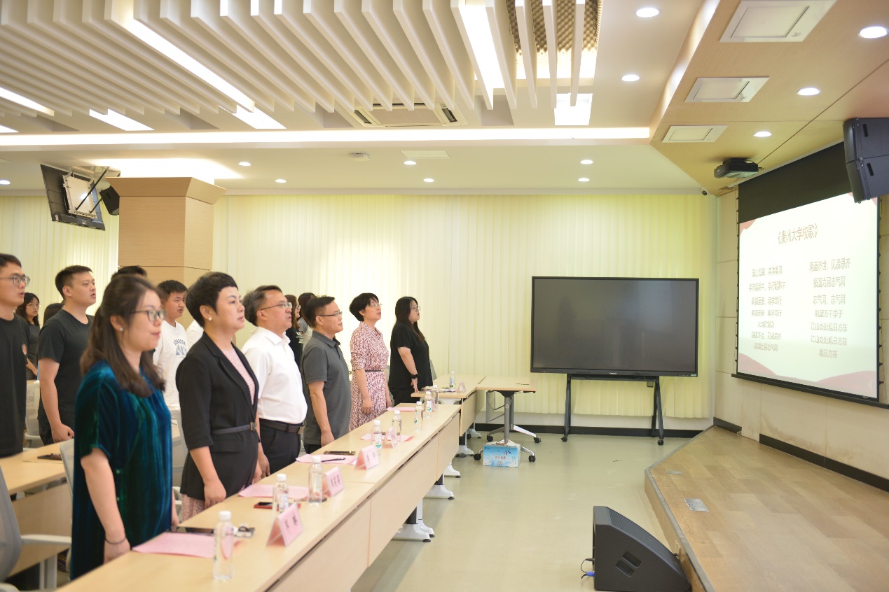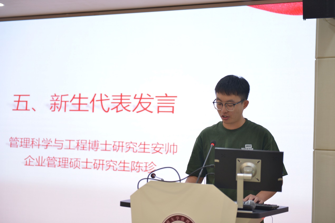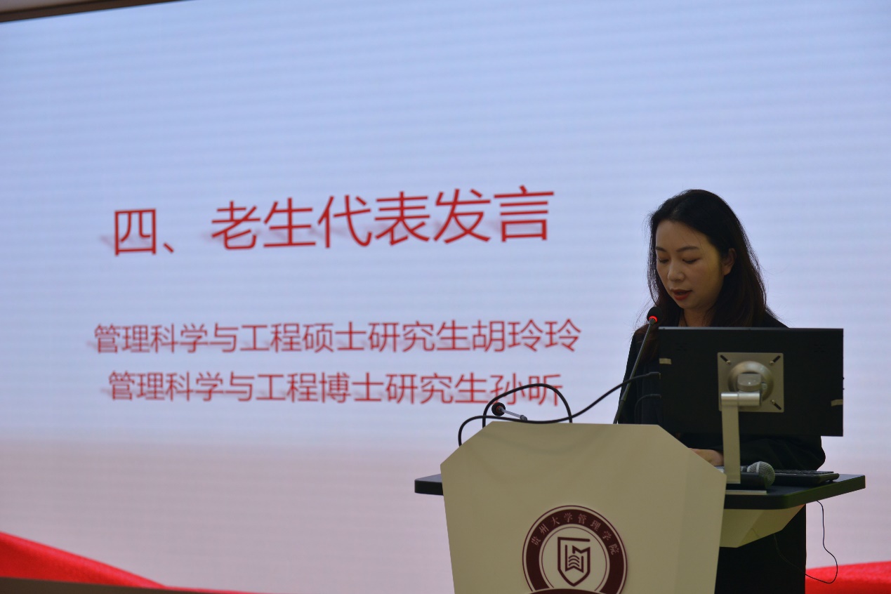 新生代表管理科学与工程博士研究生安帅、企业管理硕士研究生陈珍分享了他们对将要开启贵大学习之路的期待,他们提到,我们应该胸怀理想、志存高远,在理论学习和科研经历实践中经风雨、受教育、树理想、做贡献。随后,学院领导为新生代表们佩戴校徽。最后开学典礼在全体参会成员的校歌声中结束。