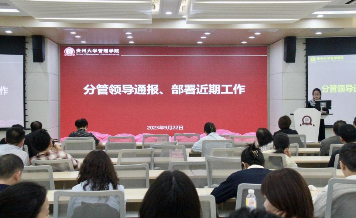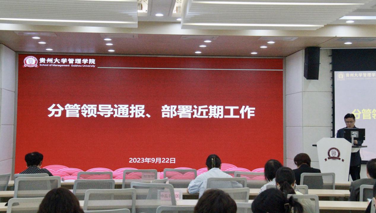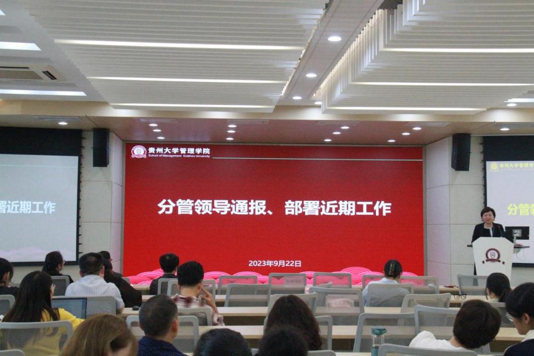 随后,学院各分管领导通报、部署近期工作。院党委副书记邓琳对学生工作、“博学计划”工作、工会工作、关工委工作了通报、部署。并按照校纪委要求,对贵州省11起违反高校教师职业行为十项准则典型案例作了通报;副院长宋山梅贵州大学教学事故认定以及处理办法(修订版)相关要求进行了通报并就一流专业建设、本科审核评估做了安排部署;副院长李本光对管理学院教学科研积分管理办法》、研究生培养、科研工作等作了通报与部署。