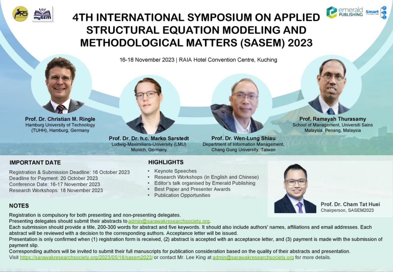 2023年11月16日至18日,乐动官方网站汤美润副教授赴马来西亚古晋RAIA酒店会议中心参加了第四届国际应用结构方程模型和方法论研讨会(SASEM 2023)。来自全球的学者和专家聚集一堂,共同探讨定量方法在管理学研究中的进步和应用。会议邀请了多位知名学者进行主题演讲,包括来自德国汉堡工业大学(Hamburg University of Technology)的Christian M. Ringle教授和慕尼黑大学(Ludwig-Maximilians University)的Marko Sarstedt教授,以及来自台湾长庚大学(Chang Gung Univerisity)的Wen-Lung Shiau教授和马来西亚理科大学(Universiti Sains Malaysia)的Ramayah Thurasamy教授。