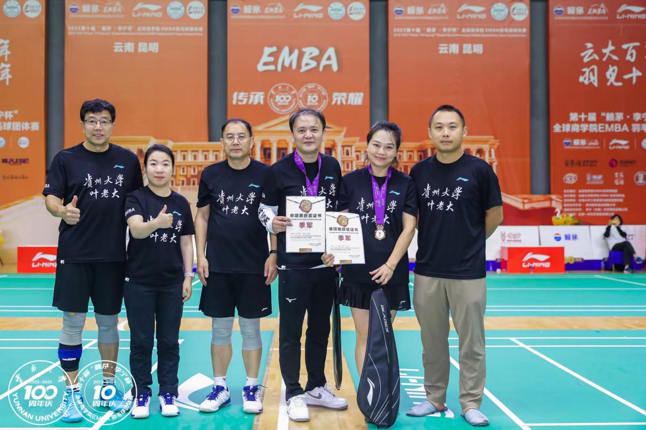 贵州大学大学管理学院EMBA校友组成的“贵州大学EMBA叶老大羽毛球队”先后与中欧商学院、厦门大学、紫荆博雅(香港城市大学/北京大学联队)、对外经贸大学、清华大学、郑州大学六支EMBA羽毛球队团体比赛,取得三胜三负的成绩,在学员常规组获得第十届全球商学院EMBA羽毛球团体赛第25名的好成绩。同时获得单项比赛90+混双(关承胤/钱柳睿)季军、男双100+(蒋元伟/胡文)第11名、青年混双(申霖/詹燕茹)第11名的成绩。