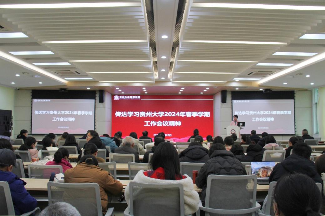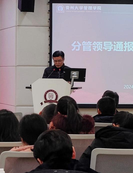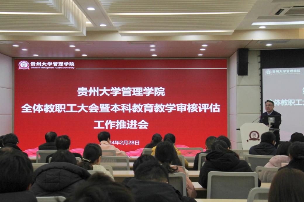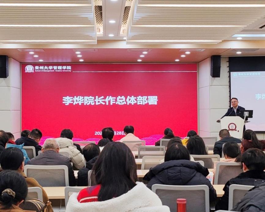 李烨院长作总体部署。他强调,要以评促建、内涵发展,要准确认识推进中国式现代化的贵州方位,明确贵州大学的具体定位,全力推进五大提升工程,即人才培养质量提升工程、科研实力提升工程、师资队伍提升工程、国际交流合作水平提升工程和服务社会能力提升工程,全面开启做强管院建设新局面,并对学院2024年重点工作作出了重点部署安排。