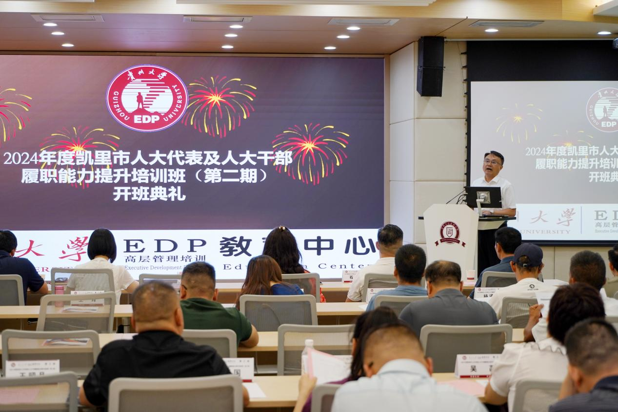 贵州大学党委委员、管理学院院长李烨,乐动官方网站EDP教育中心张勇主任,凯里市人大常委会党组成员、副主任王玲出席了开班仪式。