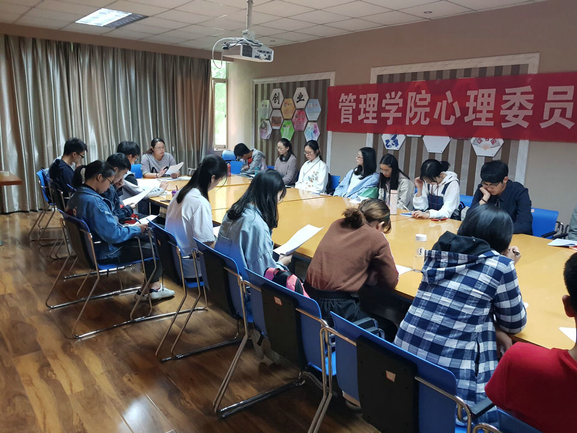 2018年4月18日中午12:40,管理学院班级心理委员培训会在二楼创客空间会议室召开,培训会由学生科科长芮丽华老师主持,2015级、2016级各班心理委员参加会议。