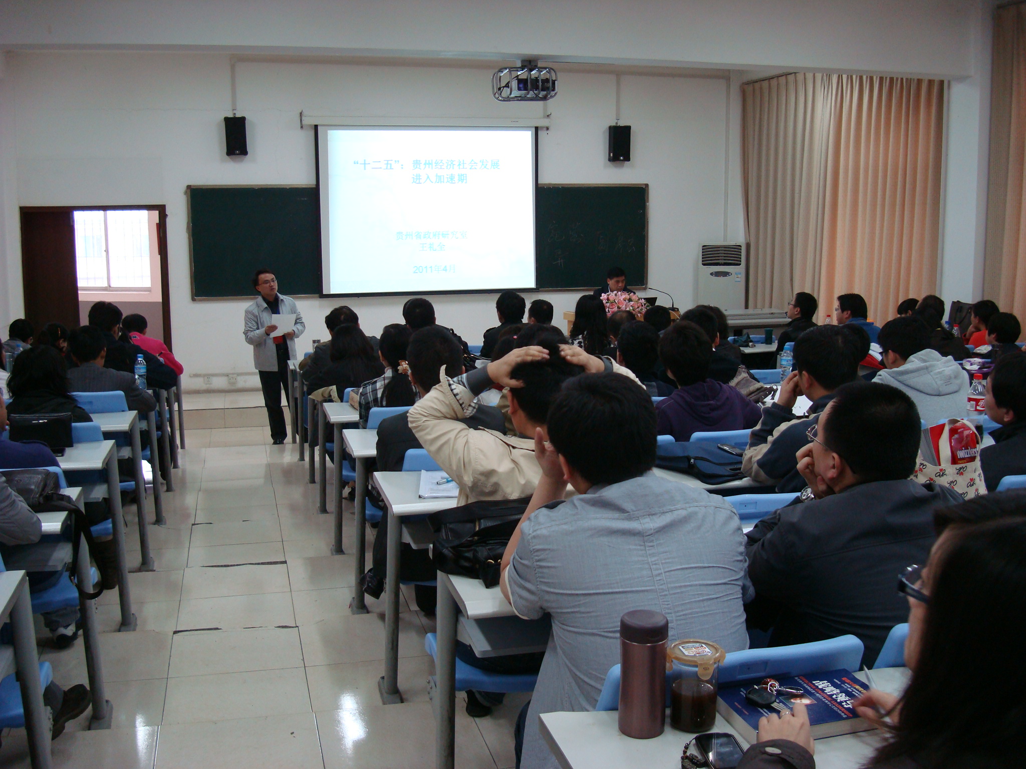 4月24日贵州省政府政策研究室、省政府发展研究中心主任&党组书记王礼全教授为MBA学员作了关于“贵州经济社会发展进入加速期”的专题报告(报告会由MBA教育中心主任李烨教授主持)。王主任就“十一五”贵州经济社会发展取得的成就、“十二五”贵州经济社会发展面临的环境、以及“十二五”贵州经济社会发展的指导思想、基本要求、及重要任务等方面为学员进行了详尽的讲解。王主任报告数据翔实,图文并茂,讲解生动。学员纷纷表示,听了王主任的报告,对贵州未来的发展充满信心,同时也深感责任重大,一定要努力学习,提升自己,积极投入进贵州省“两化带动战略”推进大潮中,为贵州加速发展、加快转型、实现跨越的战略目标早日实现做出自己应有的贡献。