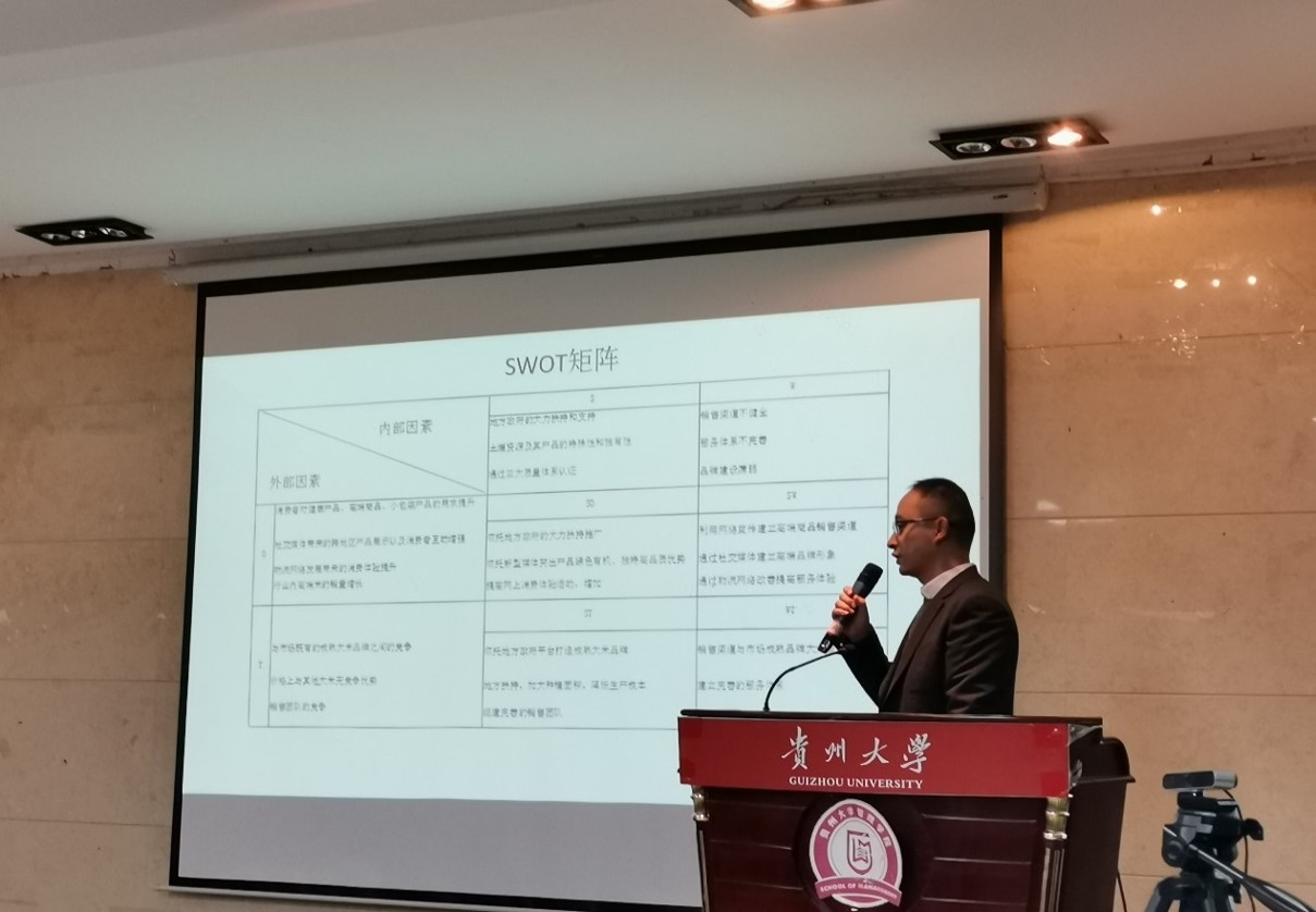 管理学院王秀峰书记总结发言。他表示这次大赛的举办是成功和圆满的,感谢学校校党委、行政各部门和麻江县委县政府各部门的大力支持。这次营销大赛的举办是把课堂延伸到了脱贫攻坚、乡村振兴的第一线,是理论与实践相结合的产物,活动后续效果和探索是非常有意义的,这样的校地合作符合“三个新发展”和“五大理念”的发展新格局,希望学校领导部门和地方政府能搭建起更多这样的平台,提供更多的合作机会。