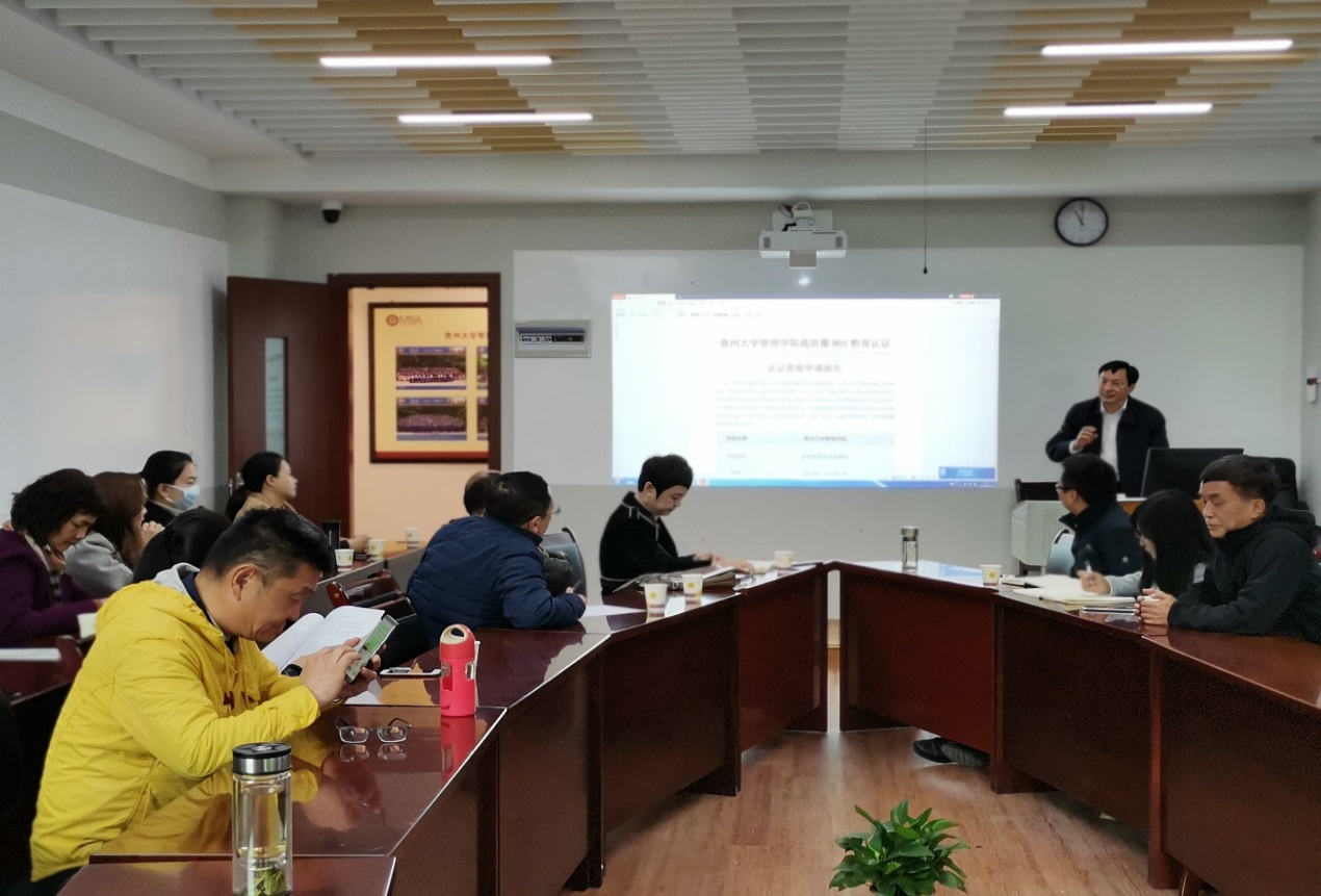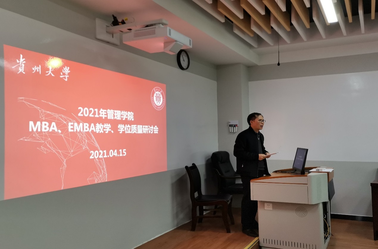 2021年4月15日上午,乐动官方网站MBA教育中心在202教室举行“2021年管理学院MBA、EMBA教学及学位质量研讨会”。贵州大学研究生院院长杜滨教授、管理学院副院长周莉莉教授、30余位MBA中心任课老师及研究生导师、MBA中心主任项凯标教授、EMBA中心主任李雨峰老师、MBA中心副主任何跃勇老师、MBA中心办公室主任邓琳老师以及中心工作人员共40余位人参加了此次研讨会。研讨会由副院长周莉莉教授主持。