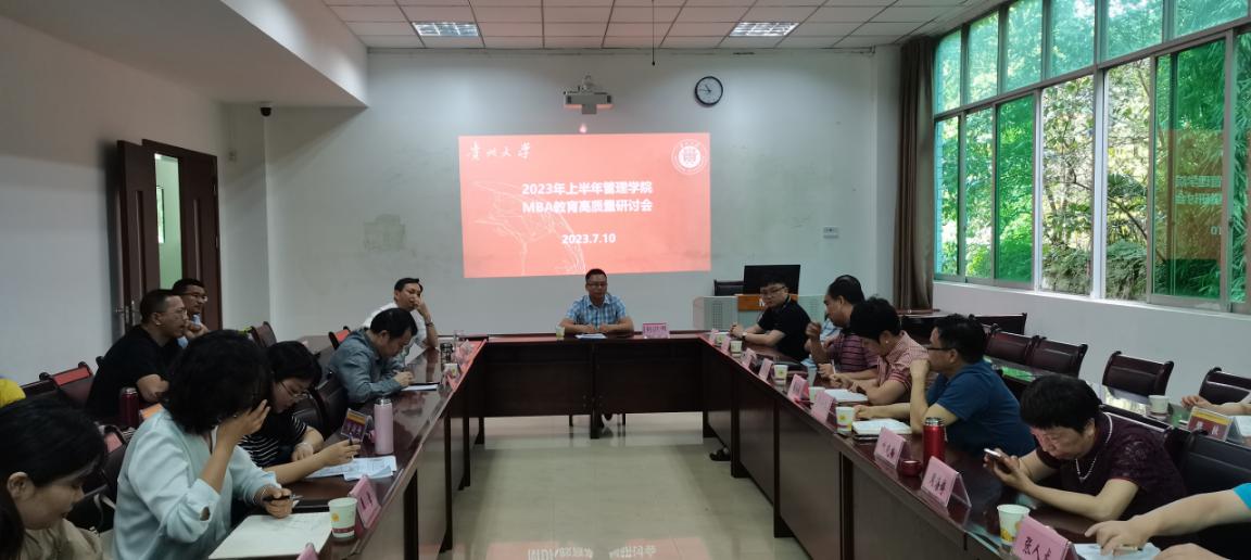 2023年7月10日上午,乐动官方网站MBA教育中心在慎思楼201教室举行了“2023年上半年管理学院MBA教育高质量研讨会”。贵州大学党委正处级组织员、管理学院党委副书记(主持党委工作)周莉莉教授,贵州大学人民武装学院副院长、管理学院副院长王婷教授,管理学院副院长李本光教授,原管理学院副院长罗敏教授,MBA中心主任项凯标教授,MBA中心任课老师、论文指导老师以及中心工作人员共30余人参加了此次研讨会。会议由MBA中心副主任何跃勇老师主持。