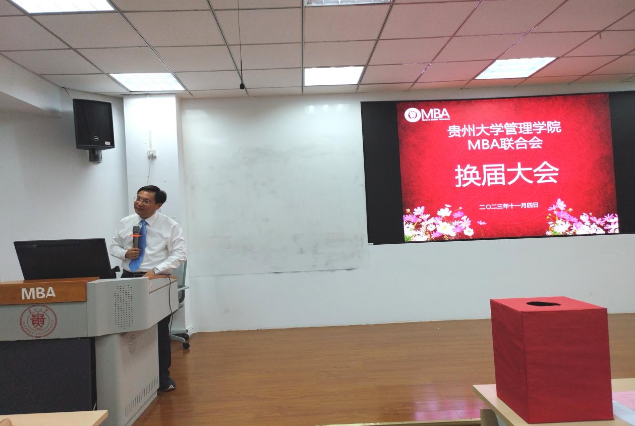 MBA教育中心主任项凯标教授致辞。他介绍了贵大MBA联合会及中国MBA联盟的一些情况,并对即将接任的第十届MBA联合会寄予了新的期望和要求。