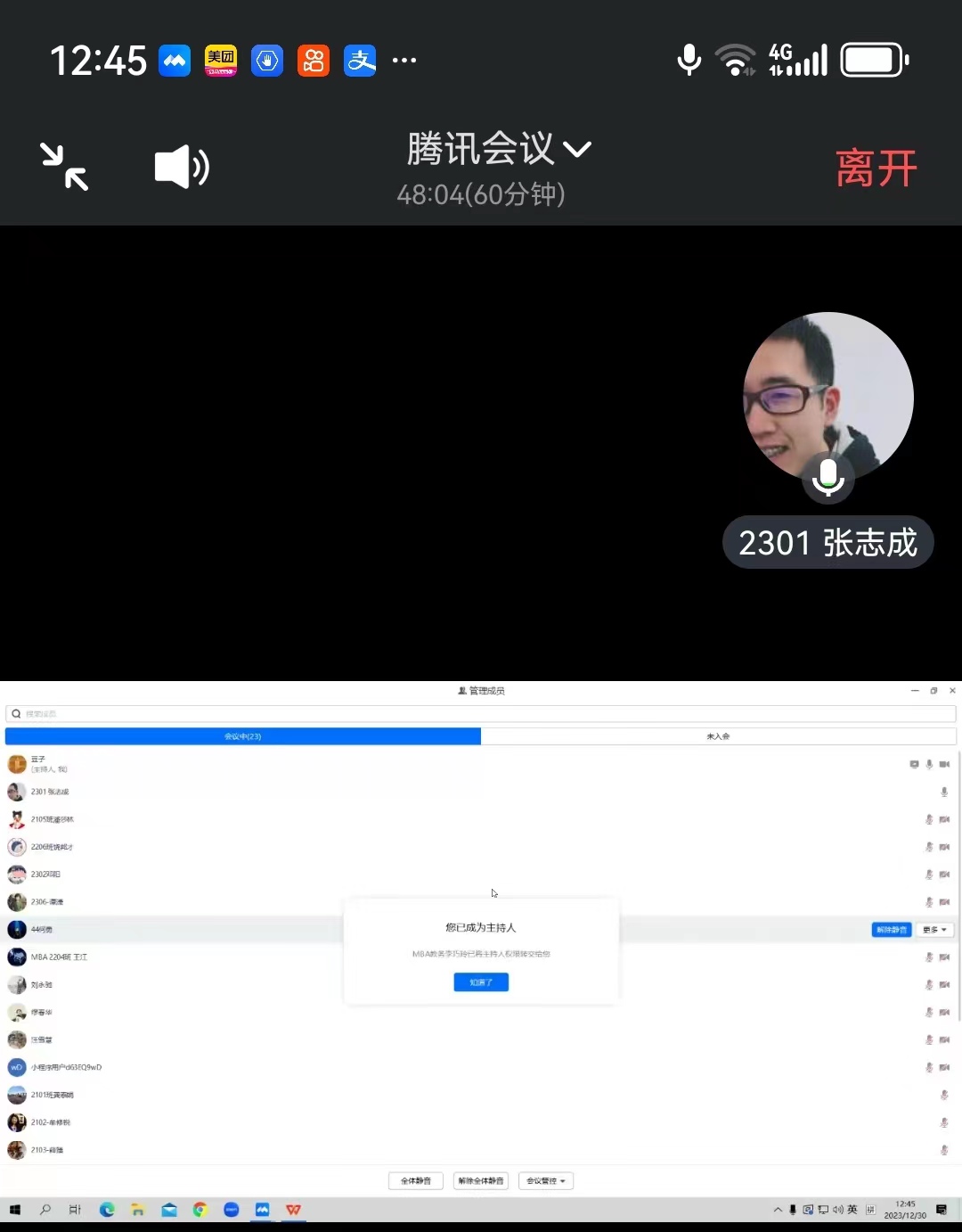 2023年12月30日,乐动官方网站MBA教育中心在慎思楼203教室举行了2022-2023第二学期班长例会。会议由MBA教育中心副主任何跃勇老师主持,MBA中心办公室主任芮丽华老师,中心李巧玲老师、凌聪老师、江滔老师、缪春华老师以及2021级、2022级、2023级各班班委等共计30人参加了此次会议。会议采取腾讯会议的方式进行。