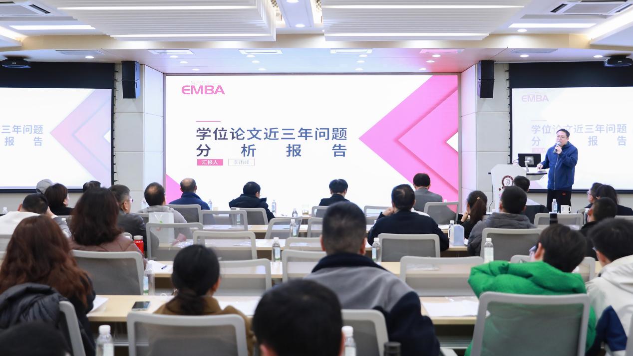 紧接着EMBA中心常务副主任李雨峰老师对EMBA学位论文近三年问题分析作报告。