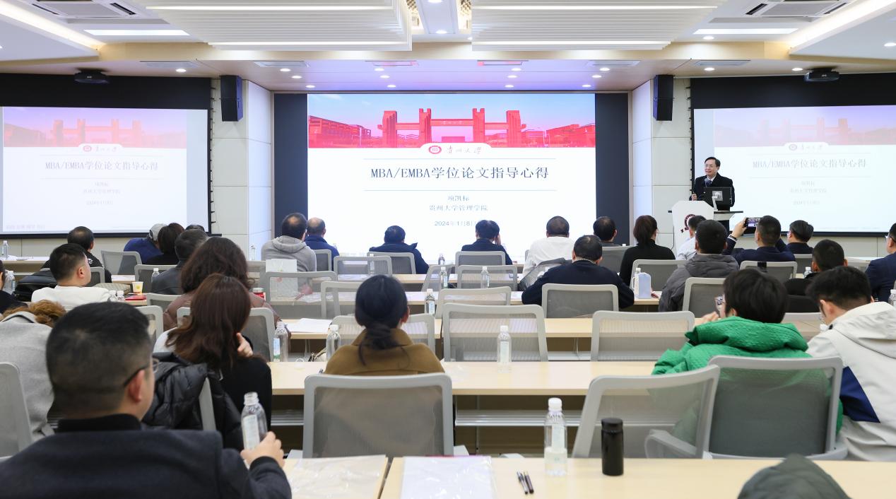 2024年1月8日,工商管理硕士(MBA&EMBA)学位论文质量提升专题工作会议在学院三楼报告厅召开。此次会议由管理学院院长李烨教授主持。贵州大学党委正处级组织员、管理学院党委副书记(主持党委工作)周莉莉教授,管理学院副院长(正处级)李本光教授,贵州大学人民武装学院副院长、管理学院副院长(正处级)王婷教授,MBA&EMBA教育中心主任、副主任,校内外工商管理硕士生导师共60余人参加会议。
