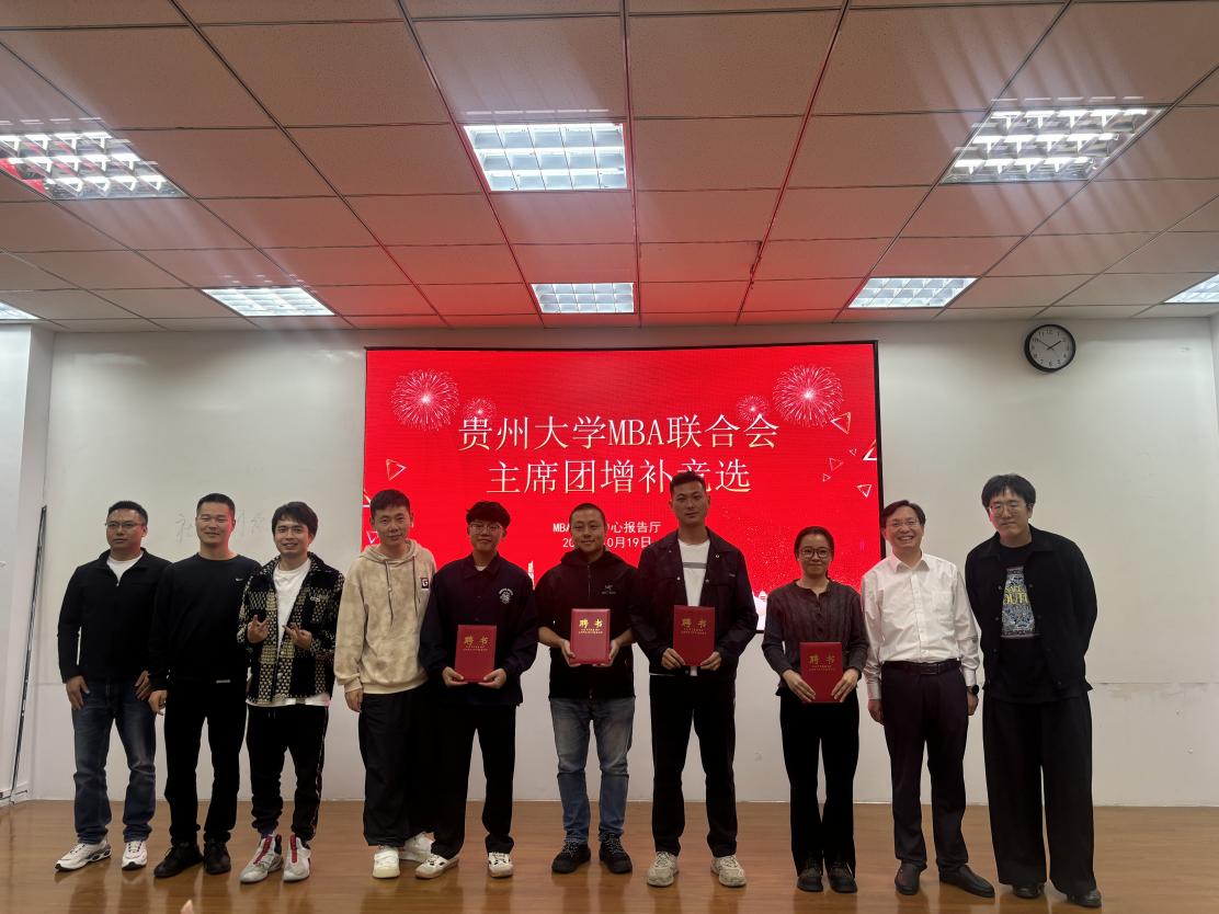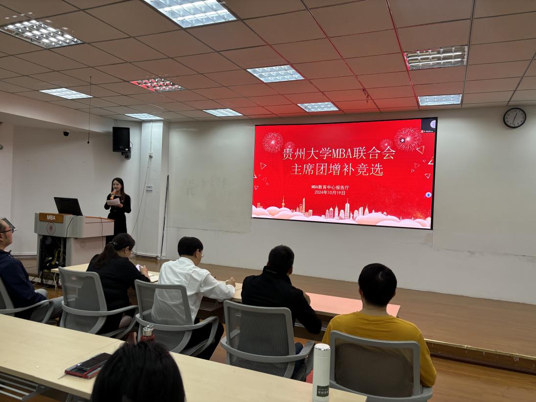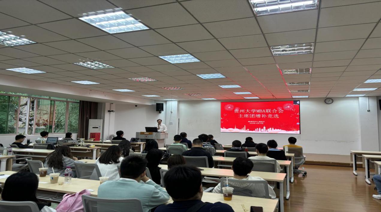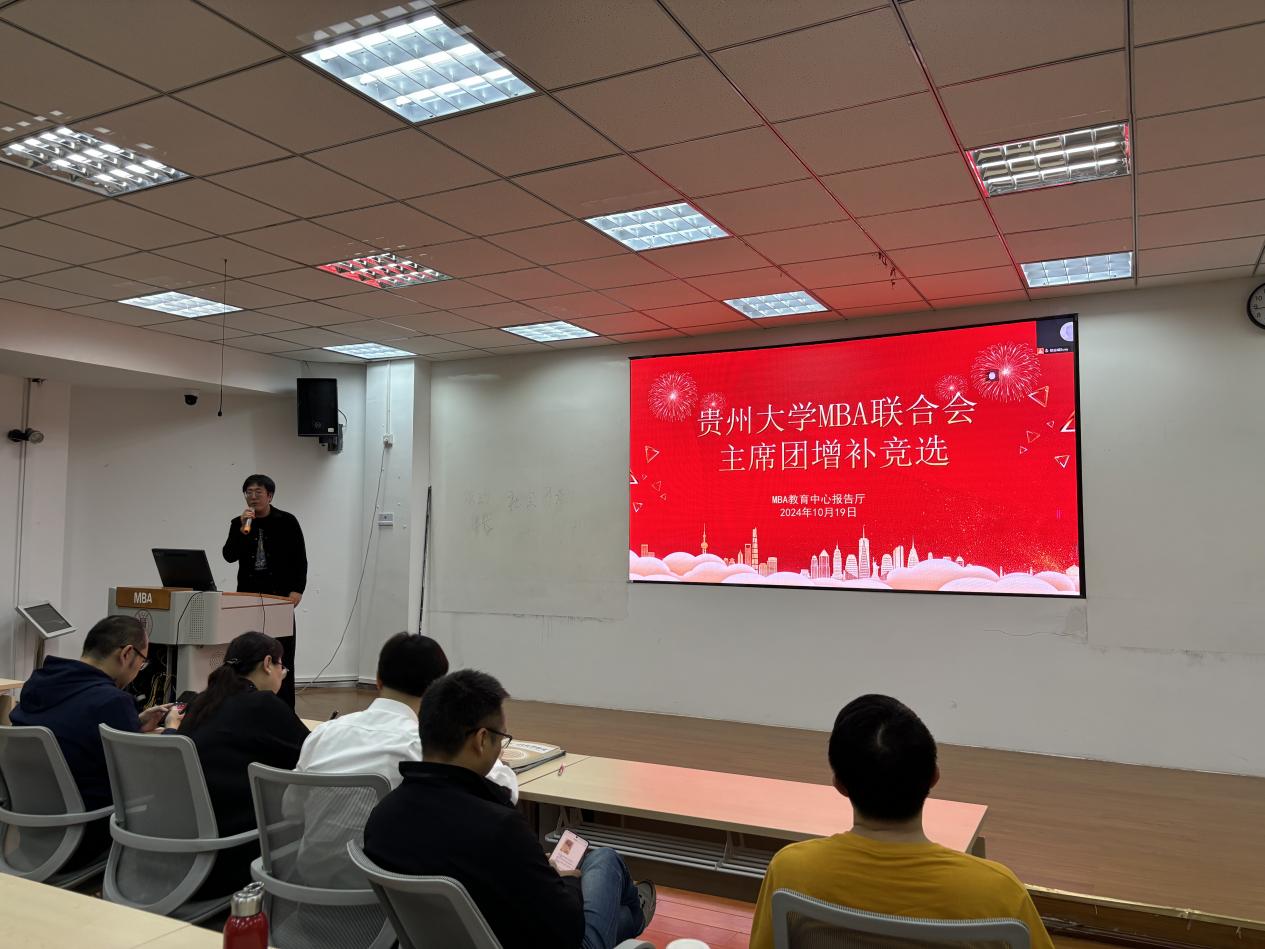 2024年10月19日下午,乐动官方网站MBA教育中心在MBA报告厅举行了“贵州大学MBA联合会主席团增补竞选”。MBA教育中心主任项凯标、副主任何跃勇、办公室主任芮丽华及中心全体工作人员,MBA第十届主席团成员和MBA2023级、2024级14个班级的学生代表共60余人参加了此次大会。